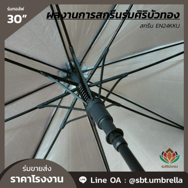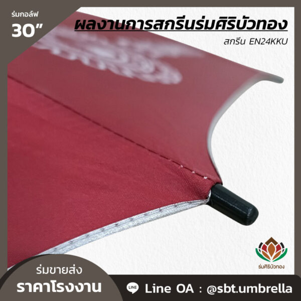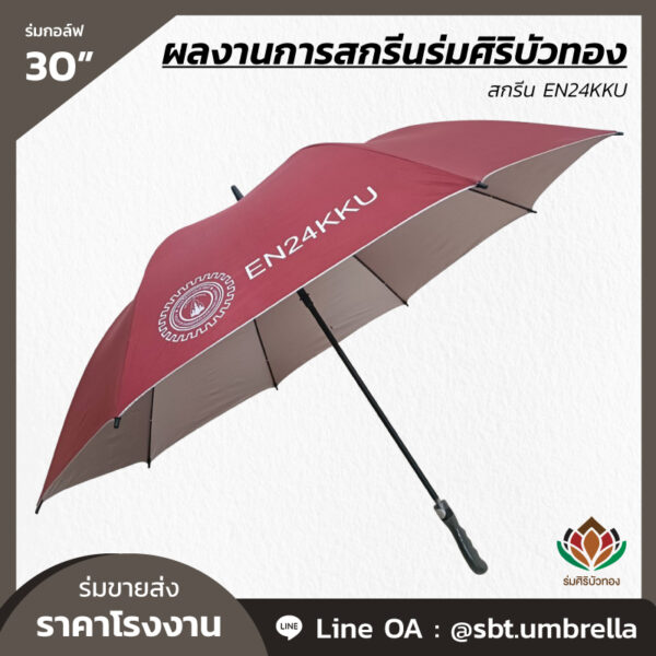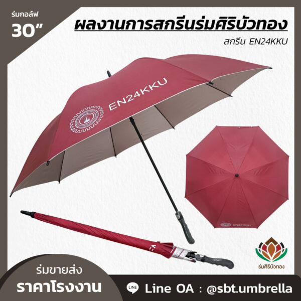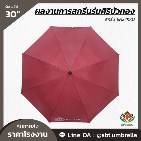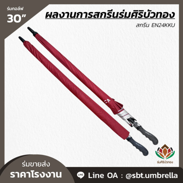 ร่มกอล์ฟ 30 นิ้ว สกรีน EN24KKU – สีเลือดหมู ผลิตจากผ้าโพลีเอสเตอร์เคลือบกันยูวี ด้ามจับกดเปิดออโต้ โครงไฟเบอร์ ตัวร่มมีขนาดใหญ่จึงเหมาะสำหรับกางในสนามกอล์ฟได้เป็นอย่างดี สามารถกันแดด กันฝนได้ดีอีกเช่นกัน