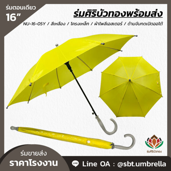 ร่มตอนเดียว ขนาด 16 นิ้ว – สีเหลือง ผ้าโพลีเอสเตอร์ ไม่มียูวี โครงเหล็ก ด้ามจับกดเปิดออโต้ สีสันสวยงาม เน้นความเรียบร้อย ดูดี เหมาะกับแจกเป็นของชำร่วยงานบุญ งานบวช และงานณาปนกิจศพ สามารถสกรีน โลโก้ ได้