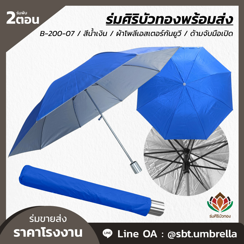 ร่มพับ 2 ตอน สีน้ำเงิน ผลิตจากผ้าโพลีเอสเตอร์เคลือบกันยูวี ด้ามจับมือเปิด พลาสติกเนื้อแข็ง โครงเหล็กแกน 10 มิลลิเมตร น้ำหนักเบา ง่ายต่อการพกพา กันแดด กันฝน เหมาะสำหรับใช้เป็นของที่ระลึกหรือใช้เป็นของขวัญวันพิเศษต่างๆ