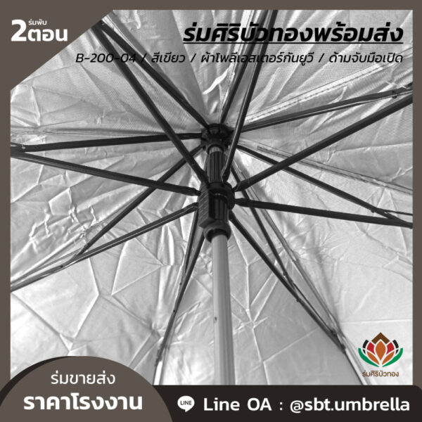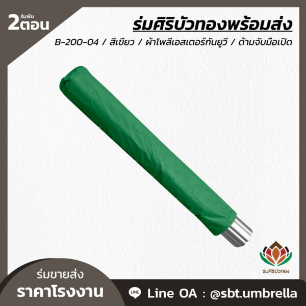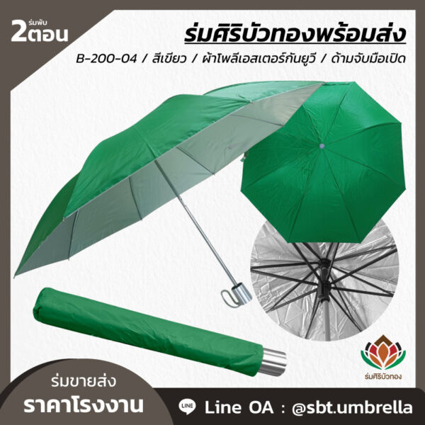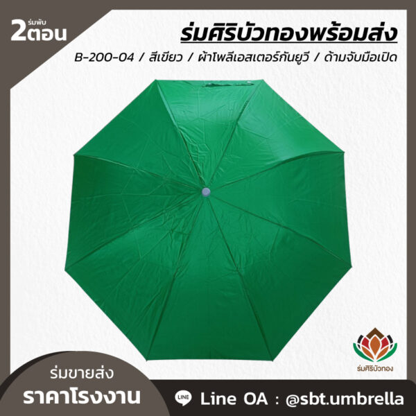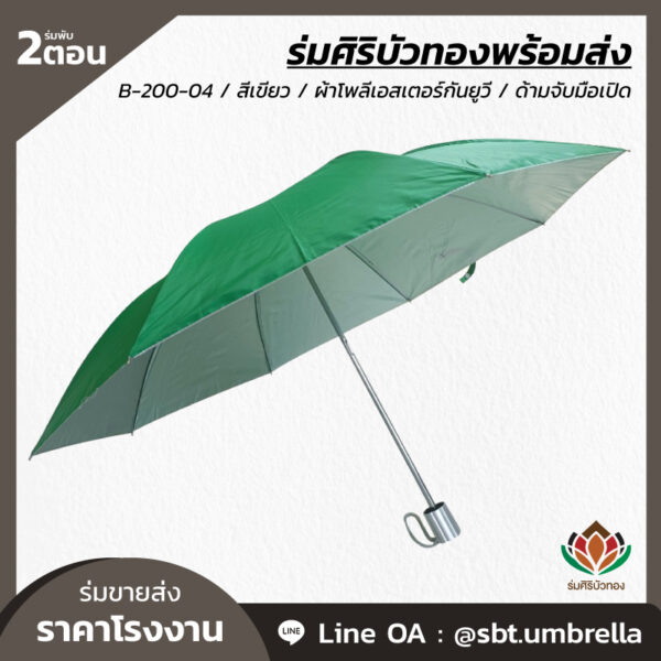 ร่มพับ 2 ตอน สีเขียว ผลิตจากผ้าโพลีเอสเตอร์เคลือบกันยูวี ด้ามจับมือเปิด พลาสติกเนื้อแข็ง โครงเหล็กแกน 10 มิลลิเมตร น้ำหนักเบา ง่ายต่อการพกพา กันแดด กันฝน เหมาะสำหรับใช้เป็นของที่ระลึกหรือใช้เป็นของขวัญวันพิเศษต่างๆ