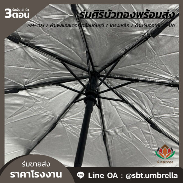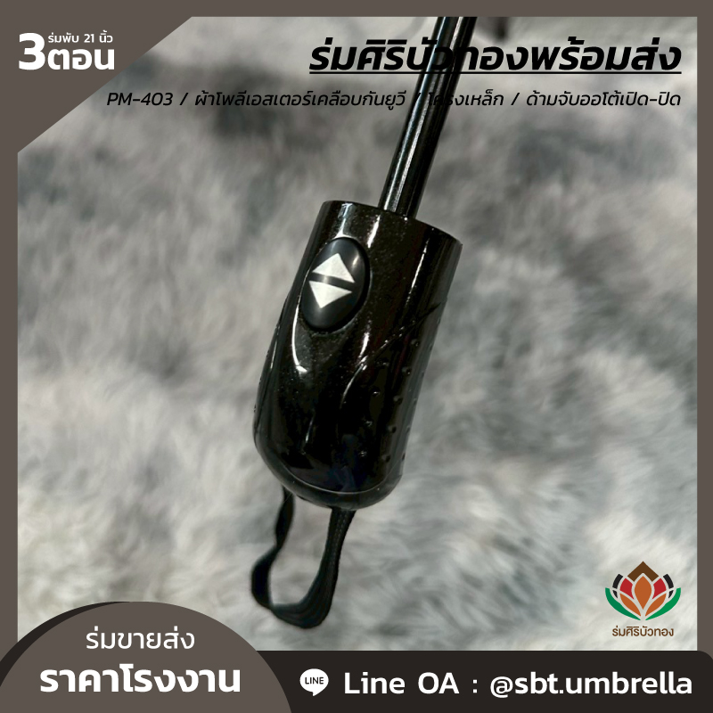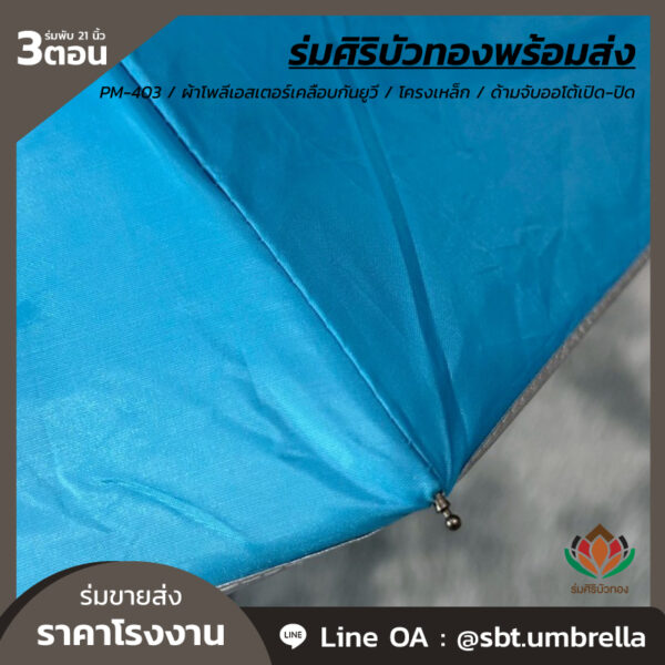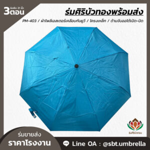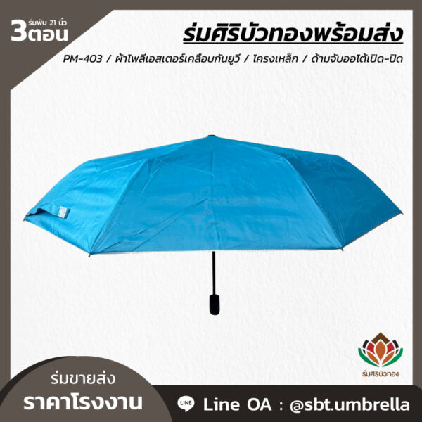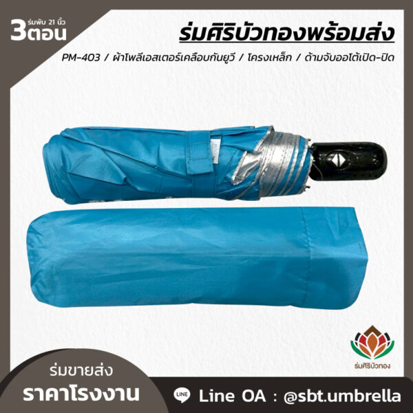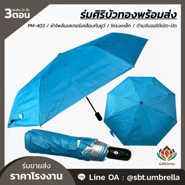 ร่มพับ 3 ตอน สีฟ้า ด้ามจับออโต้เปิด-ปิด ผ้าโพลีเอสเตอร์เคลือนกันยูวี สวยงามมาก ตัวร่มแข็งแรงทนทาน น้ำหนักเบา ง่ายต่อการพกพา กันแดด กันฝน ได้เป็นอย่างดี
