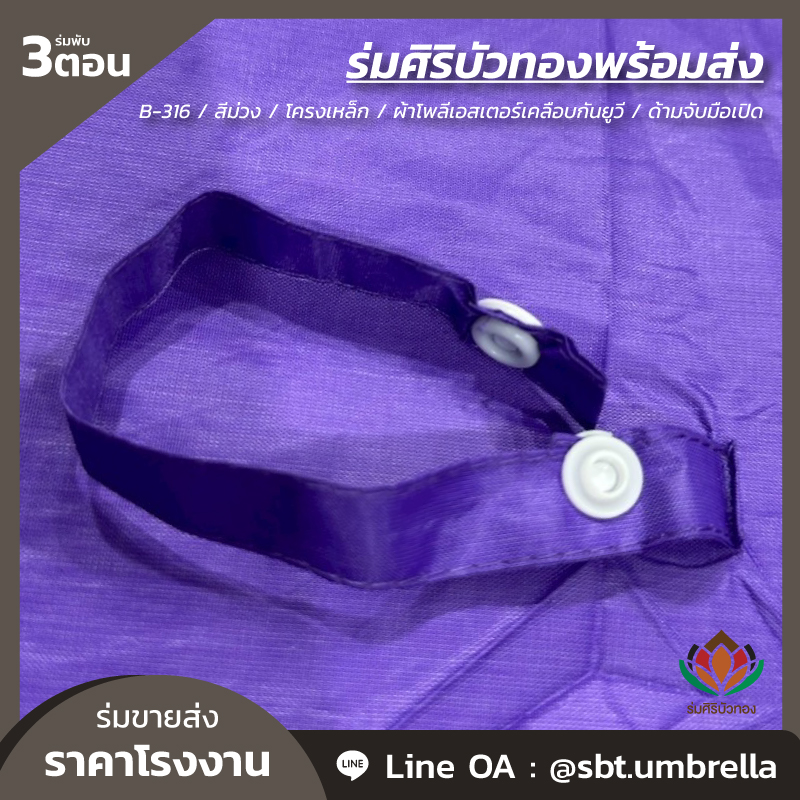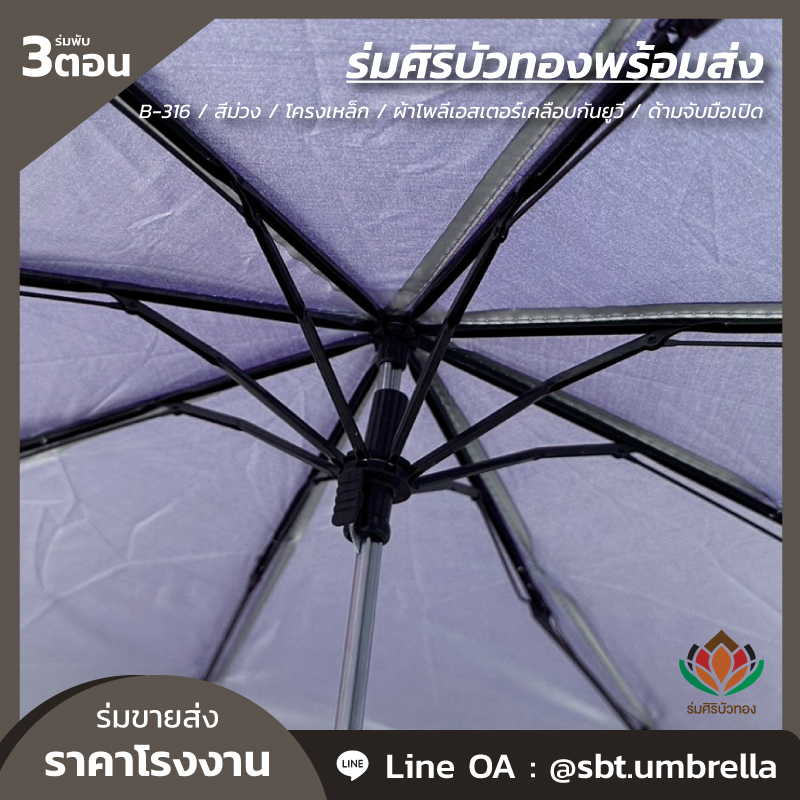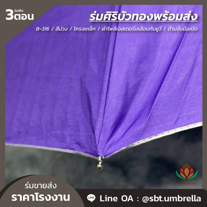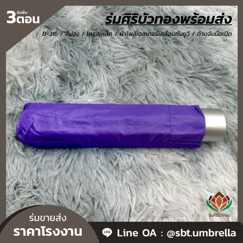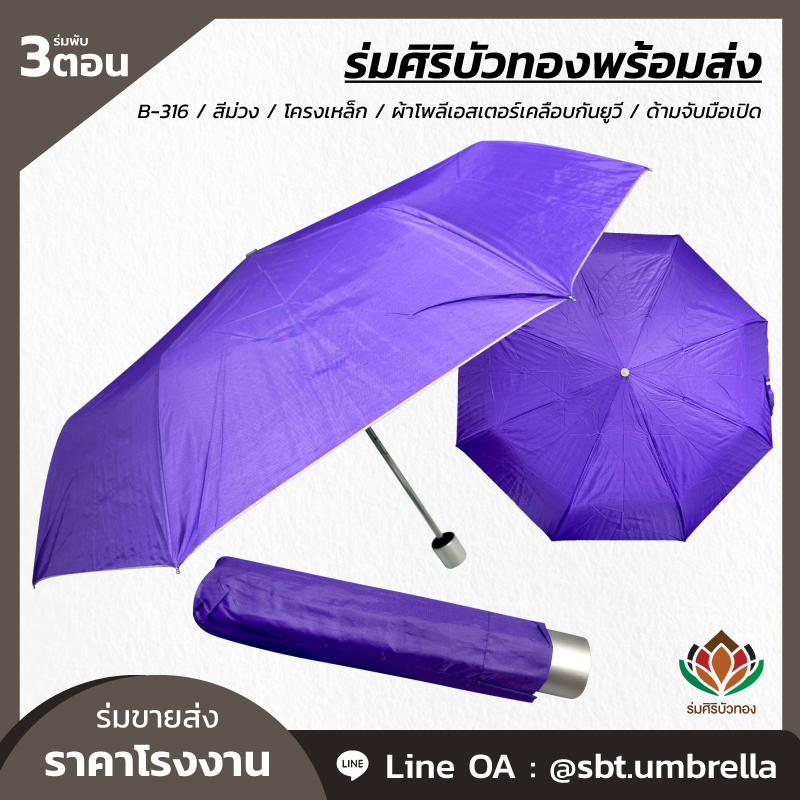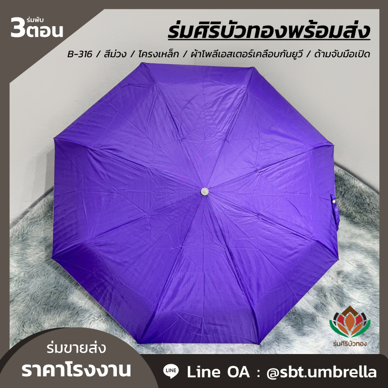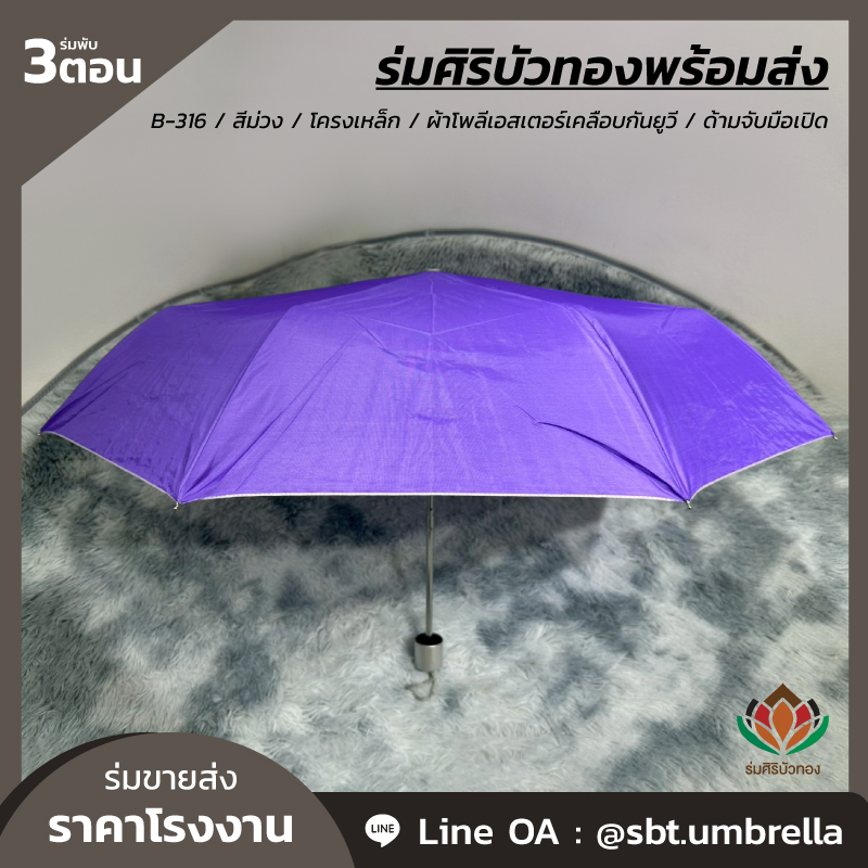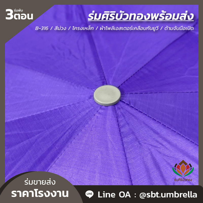 ร่มพับ 3 ตอน สีม่วง ผลิตจากผ้าโพลีเอสเตอร์เคลือบกันยูวี โครงเหล็ก ซี่ลวด 8 ก้าน ด้ามจับมือเปิด มีน้ำหนักเบา สามารถพกพาติดกระเป๋าได้ กันแดด กันฝน ได้เป็นอย่างดี สามารถนำไปใช้เป็นของที่ระลึกแจกในงานต่างๆได้เป็นอย่างดี และท่านสามารถสั่งสกรีนลวดลายแบบต่างๆตามที่ท่านต้องการได้อีกเช่นกัน เรามีทีมงานที่เชี่ยวชาญด้านการสกรีนร่มเป็นอย่างดี เพื่อตอบโจทย์ให้กับลูกค้า ให้พึงพอใจกับคุณภาพที่ดีที่สุด
