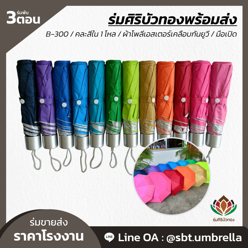 ร่มพับ 3 ตอน คละสี ขนาด 21 นิ้ว โครงร่มเป็นแบบแกนเหล็ก ซี่ลวด 8 ก้าน ด้ามจับมือเปิด เหมาะสำหรับท่านที่ต้องการร่มที่สามารถพกพาติดกระเป๋าได้ และยังสามารถนำไปใช้เป็นของที่สกรีนเพื่อทำของระลึกแจกในงานต่างๆได้